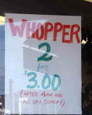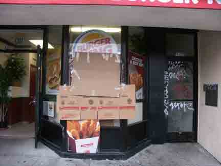 | The Burger King "closed for renovations" on Sunday, December 17th, 2006. It was reincarnated as an organic bison burger joint run by Eddie Szeto's nepher Daniel, until Daniel got fired for reasons we will not disclose here. Currently, Szeto's friend is running it for him as a inexpesive cafe. Hopes of a franchise have bit the dust. |